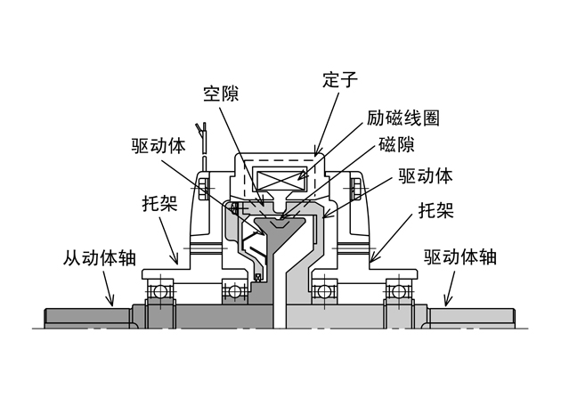 磁粉離合器是由主動(dòng)轉(zhuǎn)子(輸入軸)、從動(dòng)轉(zhuǎn)子(輸出軸)、含激磁線圈的磁軛組成,三部分相對同心裝配,形成了一個(gè)可以相對轉(zhuǎn)動(dòng)的整體,在主動(dòng)轉(zhuǎn)子和從動(dòng)轉(zhuǎn)子之間的環(huán)形空隙(工作腔)內(nèi)填有高導(dǎo)磁的合金磁粉。而對構(gòu)成磁粉離合器磁路的各種磁體,一般都應(yīng)選用導(dǎo)磁率高,矯頑力低和單位損耗小的軟磁材料制成,這些材料均須要經(jīng)過適當(dāng)?shù)臒崽幚硪缘玫搅己玫拇判阅?。對于使用不太重要的離合器,可以采用比較經(jīng)濟(jì)的鑄鐵系做導(dǎo)磁體。當(dāng)需要減少導(dǎo)磁體的渦流影響,縮小轉(zhuǎn)矩時(shí)間常數(shù)時(shí),可采用電阻率較高的材料,比如硅鋼、鐵鋁系合金等。