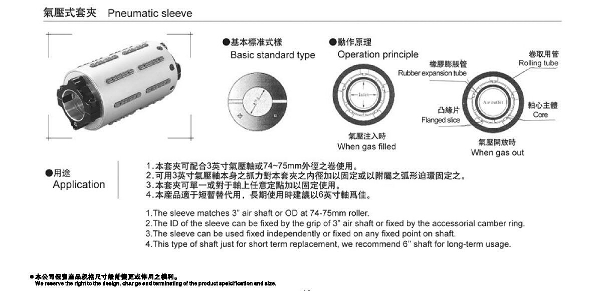 氣壓式套夾是一款非常實用的產品,而且在造價成本等方面,大大節(jié)省了客戶所要的成本。如果這根氣脹軸的長度大于等于一米的時候,客戶在選擇氣脹套方面的成本是比氣漲軸更節(jié)省成本的,而且在使用的方便方面,氣脹套還可以結合氣脹軸來使用。