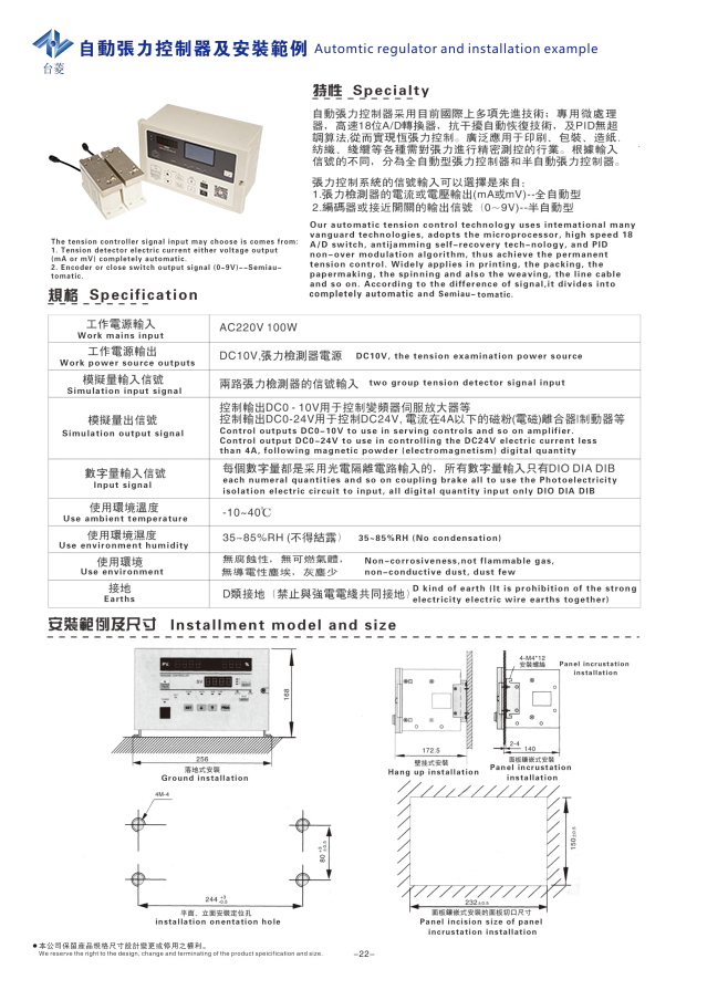 全自動張力控制器是一種高精度、多功能的全數(shù)字智能型張力控制器,配合張力檢測器組成閉環(huán)張力控制系統(tǒng)。通過接收張力檢測器傳送的信號,經(jīng)內(nèi)部PID運算處理后,調(diào)節(jié)執(zhí)行機構(gòu),自動控制材料的收/放卷張力。全自動張力控制器采用全新的圖形液晶顯示器,中、英文顯示更清晰,并針對磁粉離合器/制動器發(fā)出0~24VDC的控制電壓指令,也可輸出0~10V電壓信號控制變頻器、伺服電機或其他執(zhí)行機構(gòu)對卷料進行高精度的張力控制。